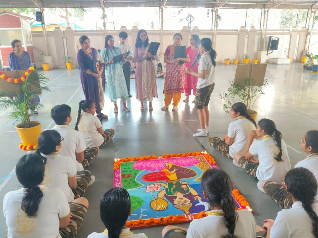 Adding depth to their visual creations, students delivered meaningful and well-prepared speeches, beautifully connecting their rangoli designs with the theme they had chosen. Their explanations reflected clarity of thought, confidence, and a strong understanding of cultural symbolism.
